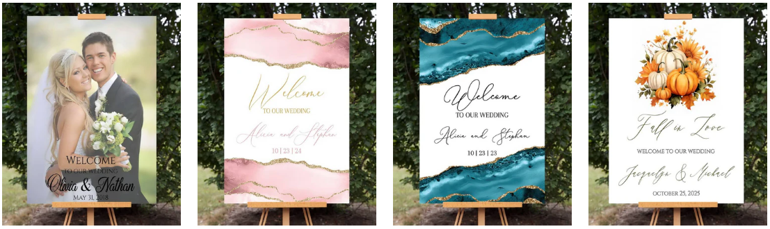 To make your event look like it all fits together, make sure your welcome sign matches your theme. For rustic weddings, you may use calligraphy typefaces and wood-textured designs. For tropical events, you could use vivid flowers and watercolor backdrops. School colors and fancy fonts could be used in graduation parties. Your event will look great if you make sure that your welcome sign template matches other décor like invitations and favor tags.