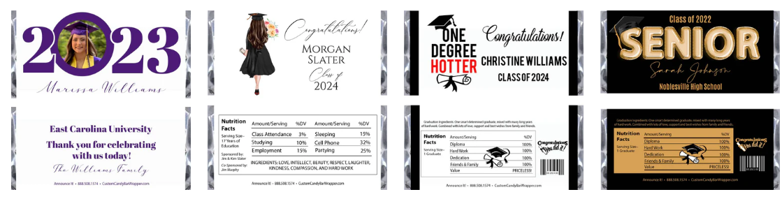 Look no further than Announce It! for exquisitely made wedding candy bar wrappers and graduation candy bar wrappers. CustomCandyBarWrapper Drawing on years of expertise producing premium, personalized candy wrappers, they provide a great range of patterns that may be customised to suit your event exactly.
